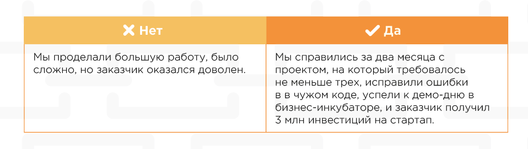 В этом помогут кейсы — истории о том, как вы решили задачу клиента, справились со всеми трудностями и вообще были молодцом. Ни один копирайтер не сможет написать такой рассказ убедительно без данных с вашей стороны — фальш будет заметна сразу.