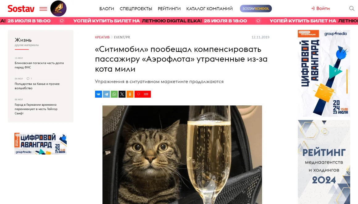 Рассказ про бодипозитивного кота Виктора, хозяину которого пришлось обманным путем проникнуть на борт самолета «Аэрофлота» — пример того, как можно в маркетинге использовать готовые истории. Компания «Ситимобил» откликнулась одной из первых и предложила Михаилу Галину, хозяину кота, вернуть бесплатными поездками мили, отобранные «Аэрофлотом» за нарушение. Вовремя «сесть на хвост» популярной истории помогает улучшить имидж компании и увеличить упоминаемость бренда.