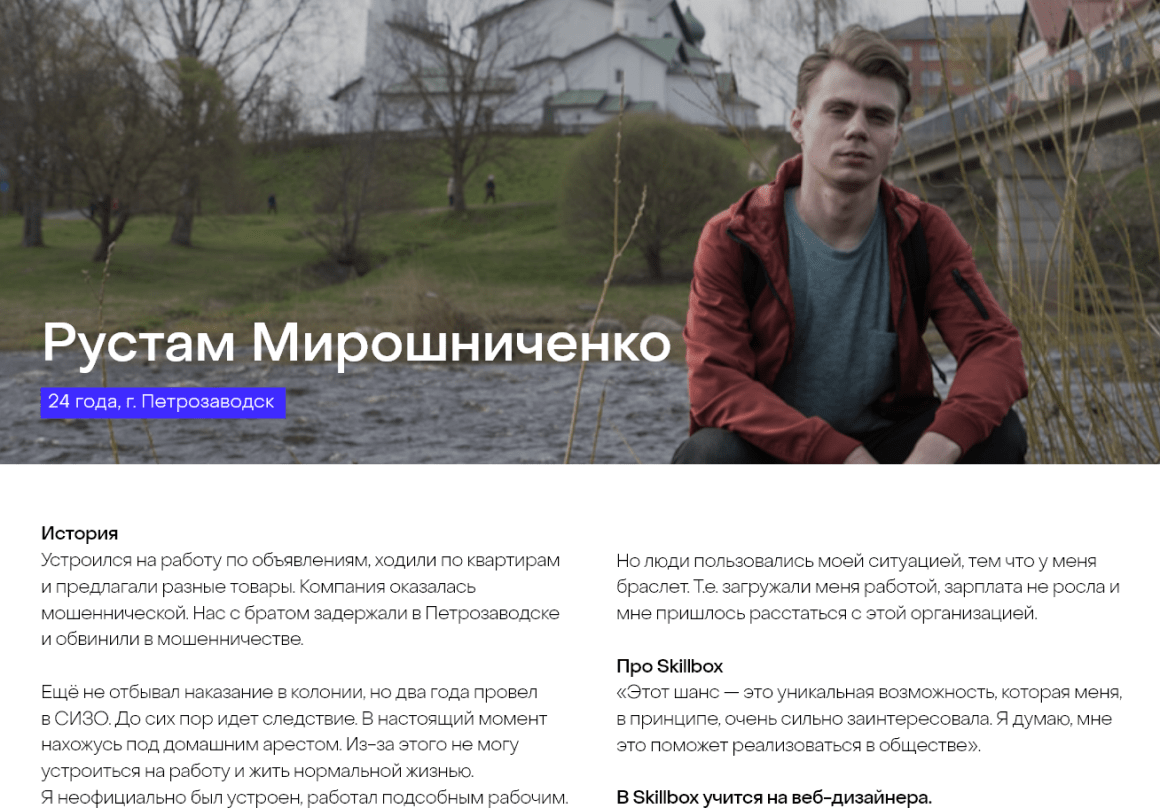 Образовательная платформа Skillbox запустила проект #Жизньпосле, целью которого стала помощь в социализации и адаптации бывших заключенных. На сайте проекта были собраны истории реальных людей. Платформа использовала проект и как инфоповод для PR, и как доказательство возможности образования изменить жизнь к лучшему.