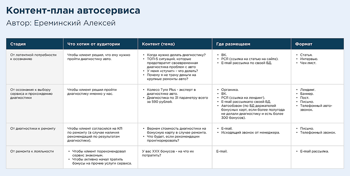 Для таких услуг, как техническое обслуживание, замена трансмиссионного масла, шиномонтаж нужен будет отдельный контент-план, потому что эти услуги клиенты автосервиса приобретают по другим причинам.