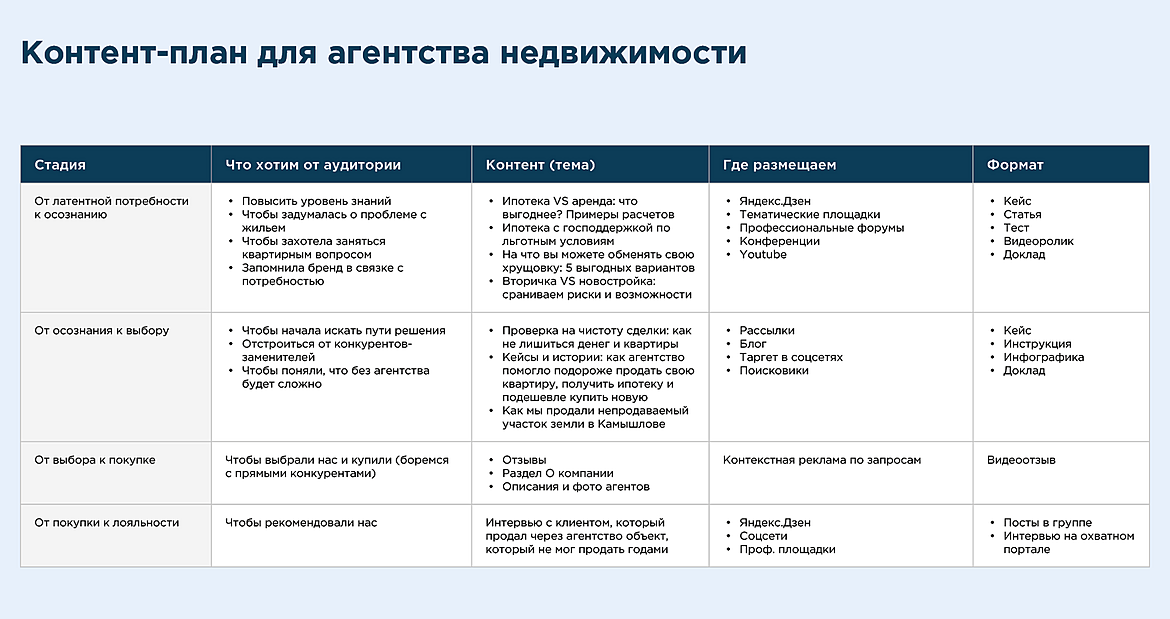 Такой план поможет выпускать контент по недвижимости системно. Если вы не будете его учитывать, рискуете потерять нужную вам целевую аудиторию. Например, потенциальным клиентам нужны кейсы — истории состоявшихся клиентов агентства недвижимости как иллюстрации вашей надежности.