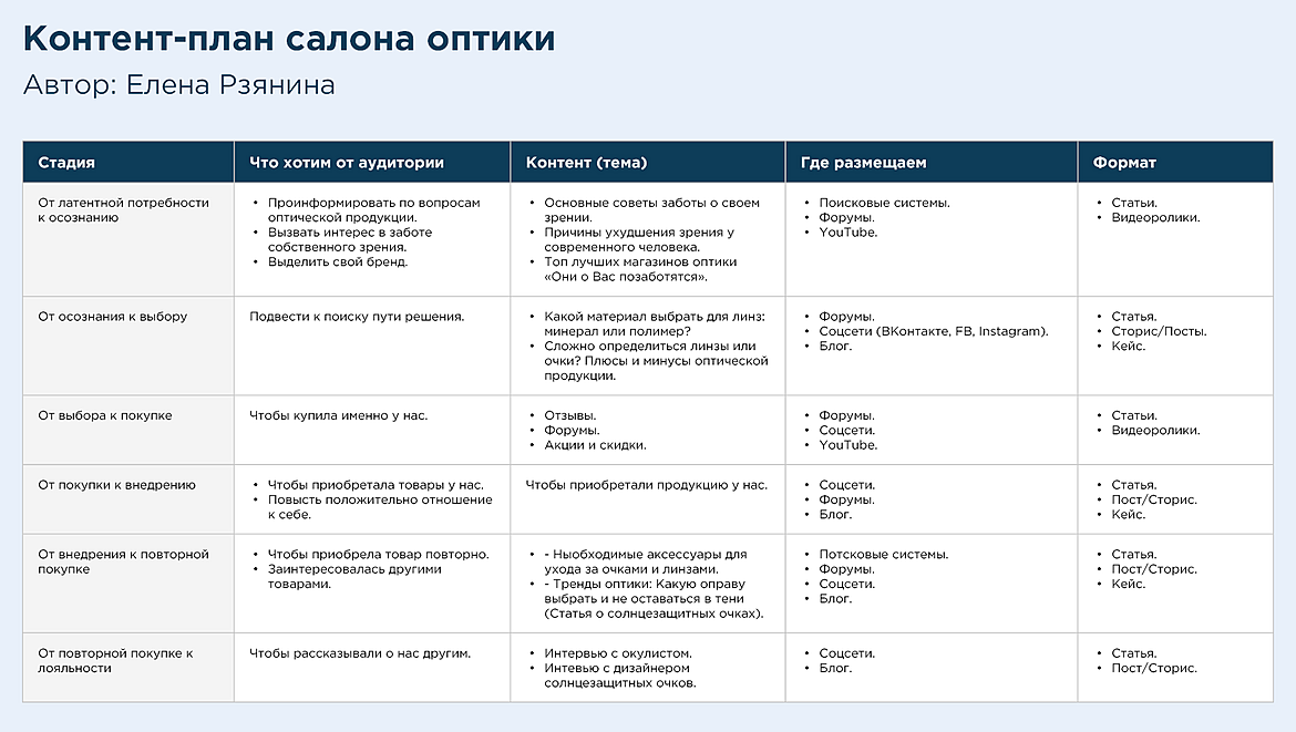 Вот пример контент-плана для салона оптики от одной из моих студенток: